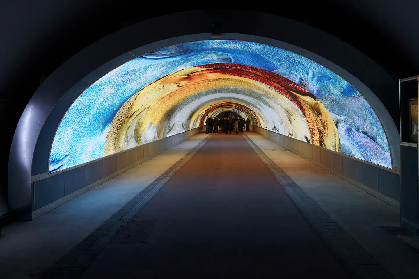 La inauguración llega con una obra de Refik Anadol, titulada Data Tunnel: una instalación inmersiva guiada por inteligencia artificial sobre una pared LED curva de gran formato (1.000 m²) y casi 100 metros de desarrollo, concebida como legado permanente del proyecto cultural transfronterizo. La galería acaba de ser inaugurada, el 16 de diciembre de 2025.